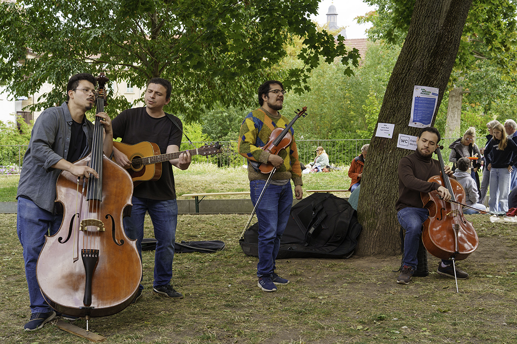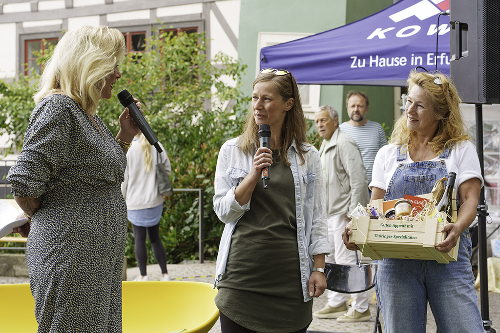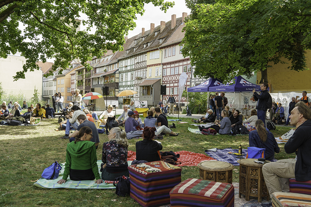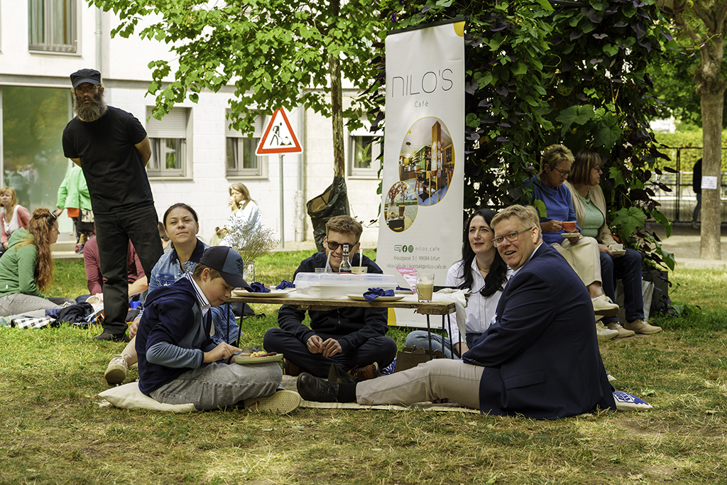 Am Sonntag, 24. August 2025 erwartete die Picknickbegeisterten an der Mikwe hinter der Krämerbrücke ein buntes Programm. Julia Maronde und Anne Martin plauderten mit Maria Stürzebecher und Martin Sladeczek über die mittelalterliche „Foodmeile“ Krämerbrücke mit Gewürzhandel, Garküchen und Bratrosten. Und die heutigen Händlerinnen und Händler der Krämerbrücke erzählten ihre Geschichten und stellen ihre kulinarischen Delikatessen vor.